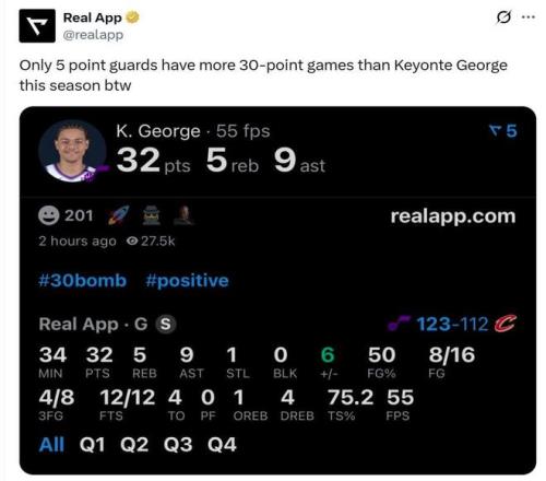 同时本赛季也只有5名控卫球员单场30+场次比基扬特-乔治更多,这意味着,乔治不仅正在飞速成长为爵士队新的后场核心,也在成为NBA新生代后场球员中的佼佼者。