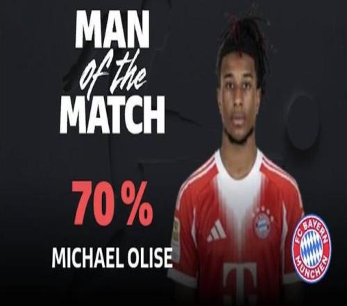 德甲第16轮,拜仁慕尼黑主场8-1大胜沃尔夫斯堡,此役贡献两球一助的拜仁边锋奥利塞当选德甲官方全场最佳球员。
