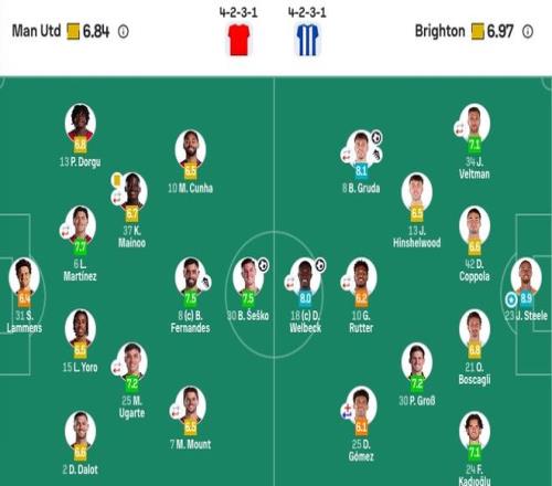 布莱顿首发:23-斯蒂尔、21-博斯卡利、24-卡迪奥卢、34-维尔特曼(77’ 26-阿亚里)、42-库博拉、8-格鲁达、13-辛谢尔伍德、25-迭戈·戈麦斯(77’ 6-范赫克)、30-格罗斯、10-鲁特尔(83’ 19-科斯托拉斯)、18-维尔贝克(78’ 22-三笘薰)